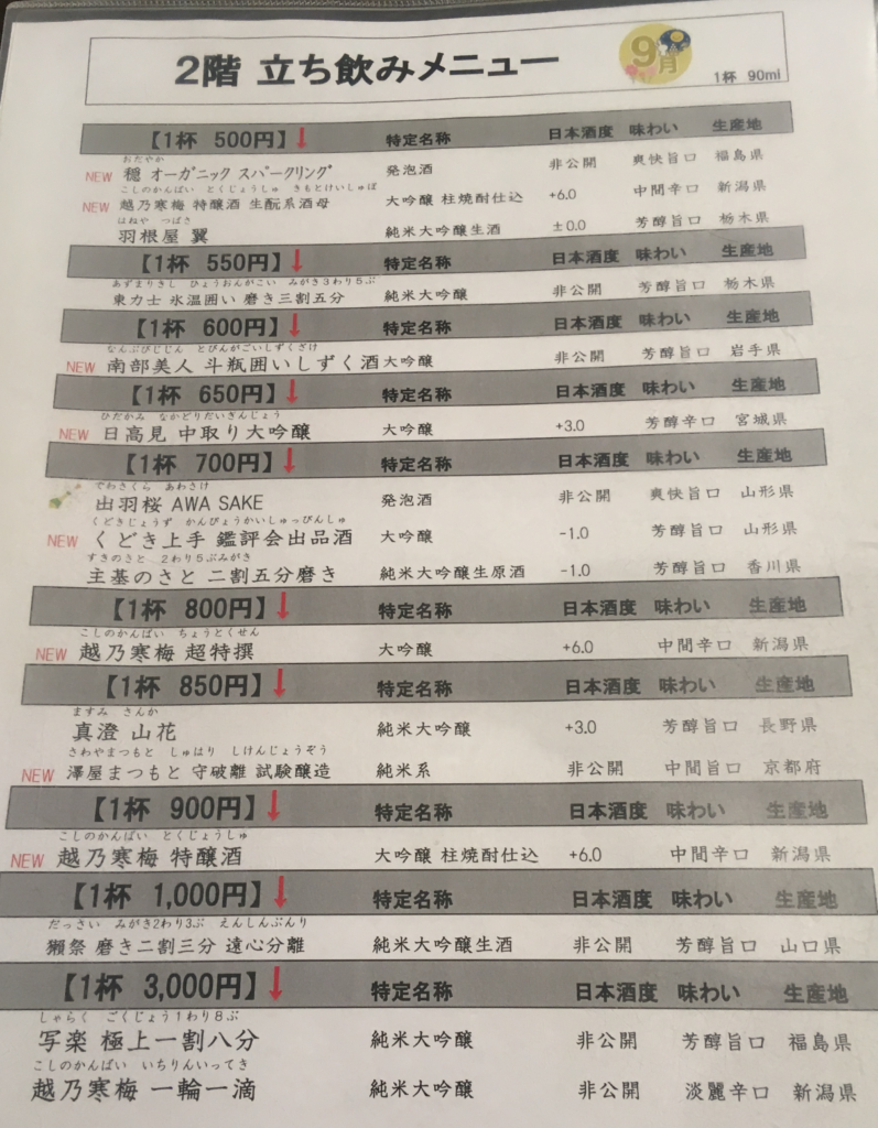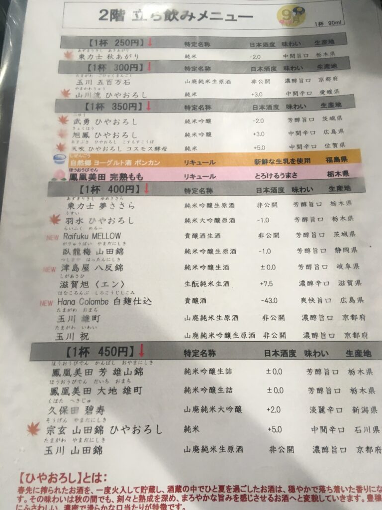 立ち呑み栗原は、他の立ち飲み日本酒店と比較しても圧倒的にリーズナブルな価格設定でした。