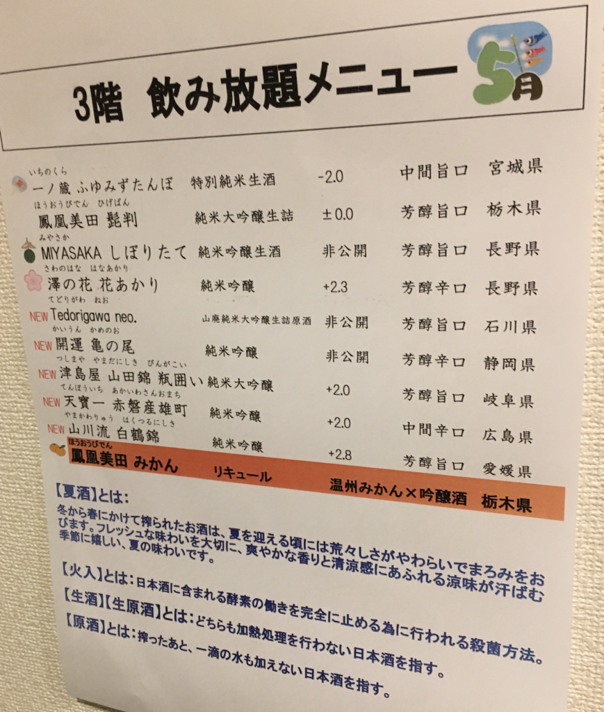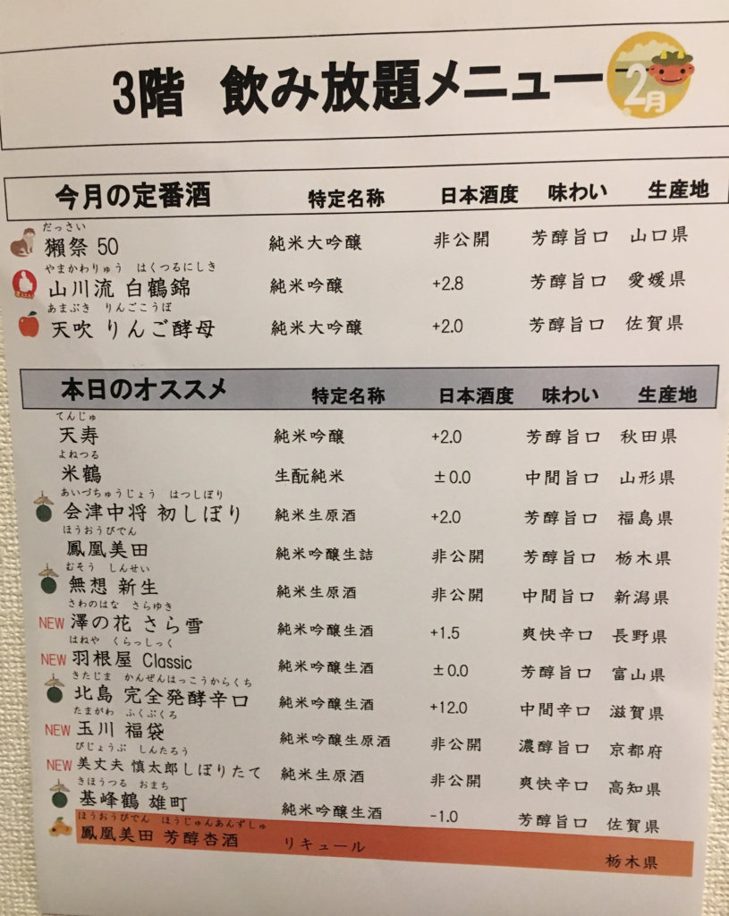 一方で、3階の飲み放題は 約10種類の日本酒が好きなだけ楽しめるという太っ腹システム。