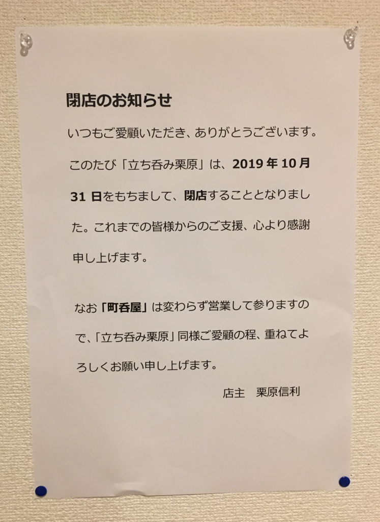 立ち呑み栗原は、2019年10月31日をもって閉店しました。