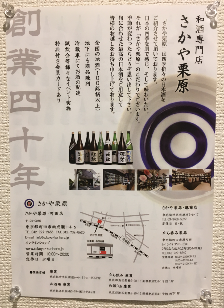 立ち呑み栗原は、和酒専門店「さかや栗原」(南成瀬)の系列店。