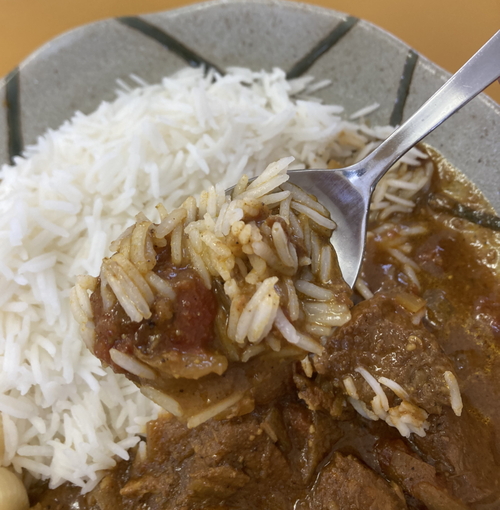 ライスは、おそらくタイ米。長粒米の軽い食感が、いかにもエスニック寄りで、「ミールスはなくとも、Roost らしさはしっかり残っている」。