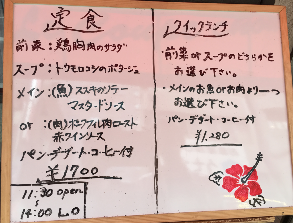 この日のコースは、前菜、スープ、メイン料理にパン、デザート、コーヒーがついた1名 ¥1,700のランチコース。