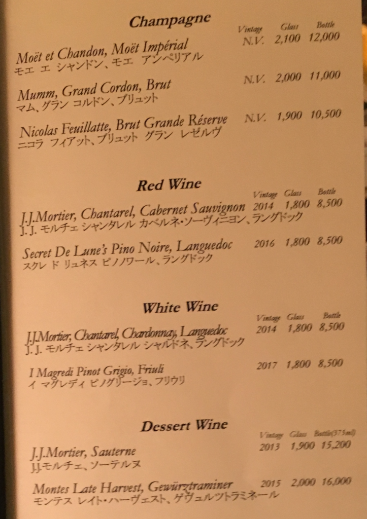 これは通常のメニューとは別に企画されたもので、赤ワイン、白ワインはもちろんのこと、それに加えてシャンパンが3種類も自由に飲めるという夢のような内容でした。