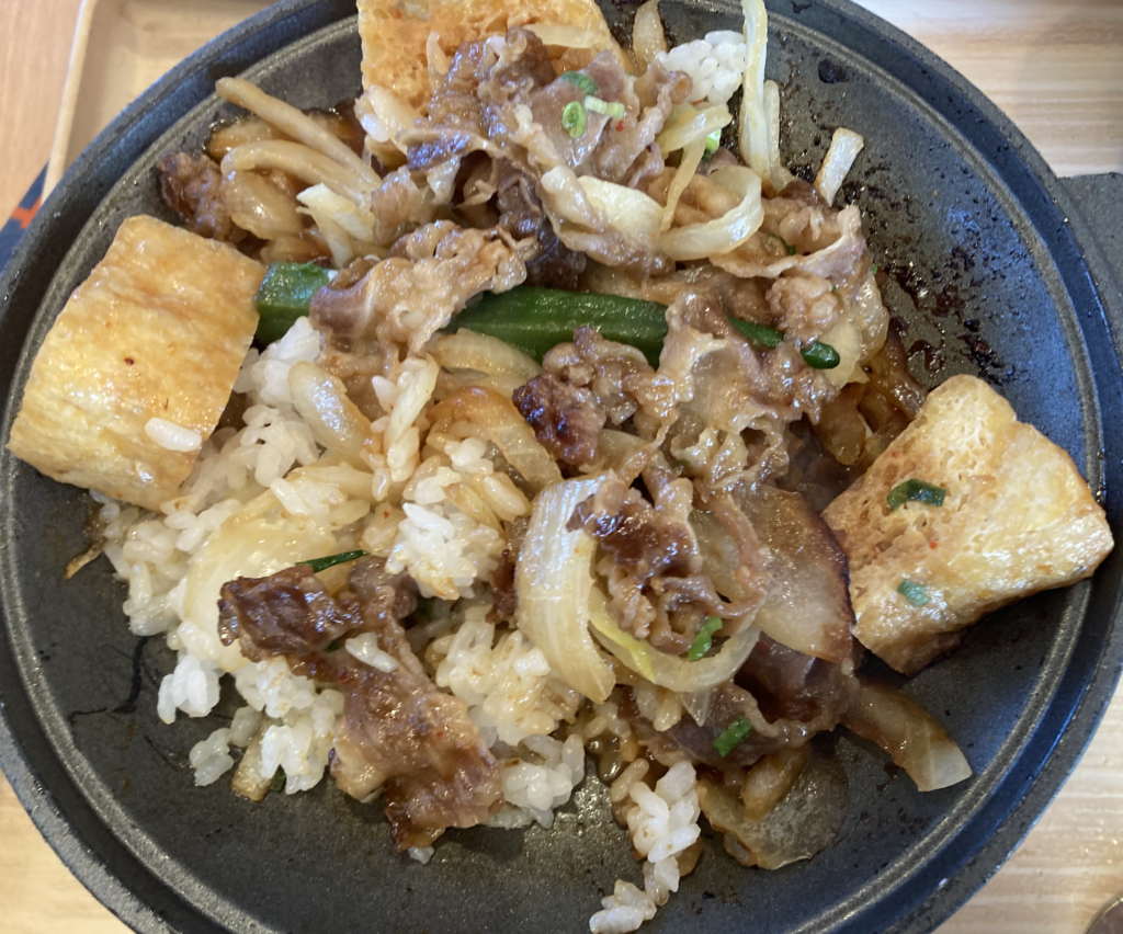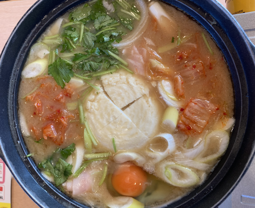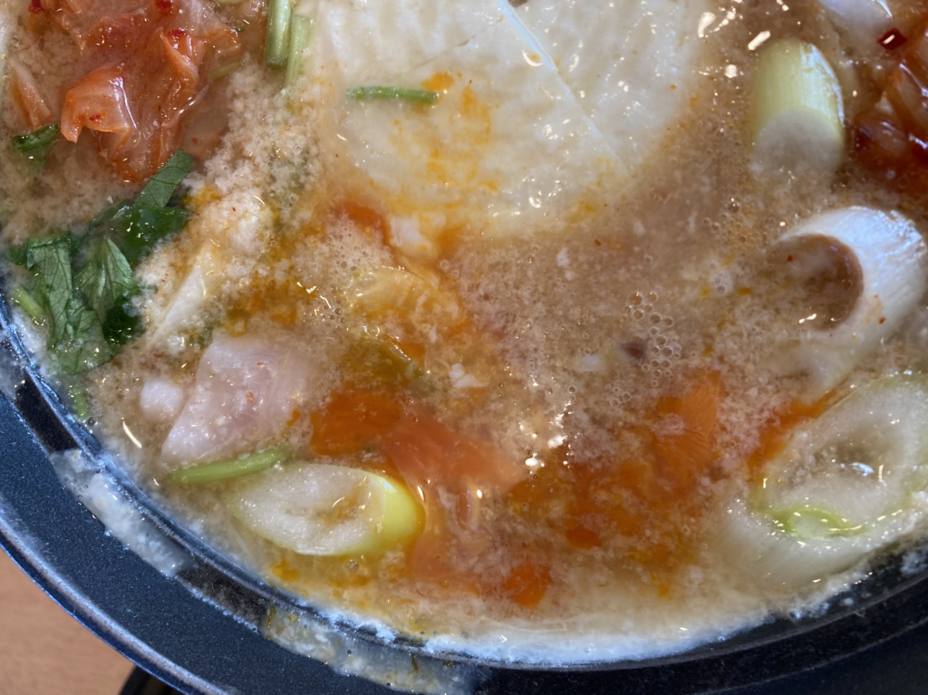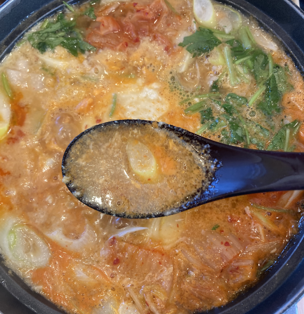 スープは和風出汁ベースに唐辛子の辛さがしっかり乗った、体がじんわり温まる味わい。豆腐のやさしい旨味と、豚肉のコクが混ざり合い、チゲらしい味の強さと和の出汁感が同居しています。時折顔を出す野菜やきのこの甘味も良いアクセントになっている。