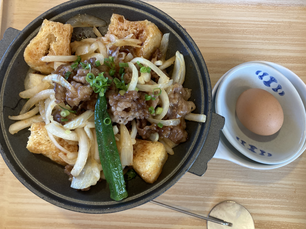 そのまま一口。甘辛いタレがしっかり絡んだ牛バラ肉は、やや濃いめながら和風寄りの甘味とコクが特徴。栃尾揚げは表面が香ばしく、中はふっくらとしていて、甘辛タレとよく合います。