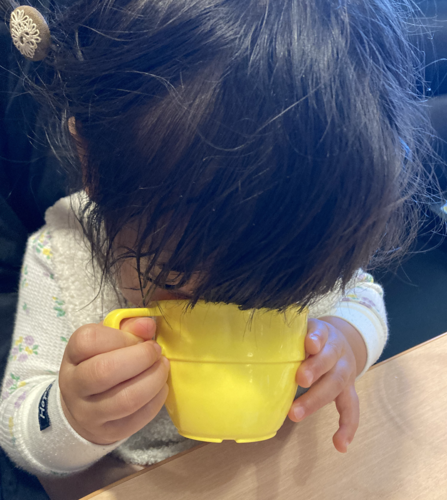 娘はオレンジジュースを自由に楽しんでいました。