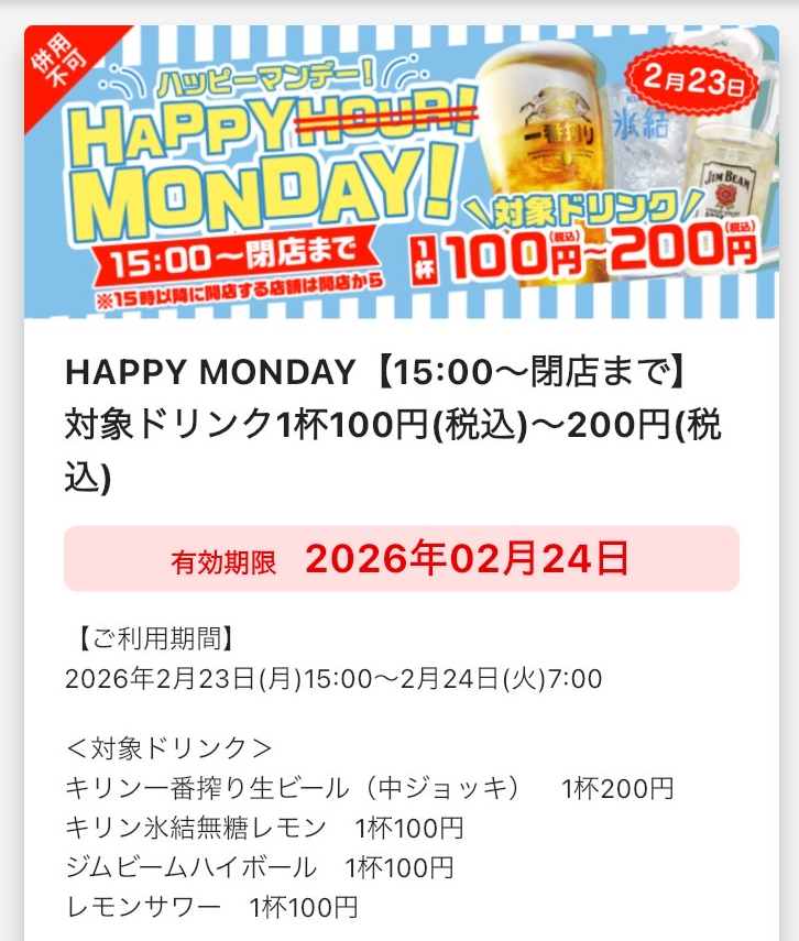 HAPPY MONDAY!17:00〜閉店まで。対象ドリンク 1杯100円〜200円!
