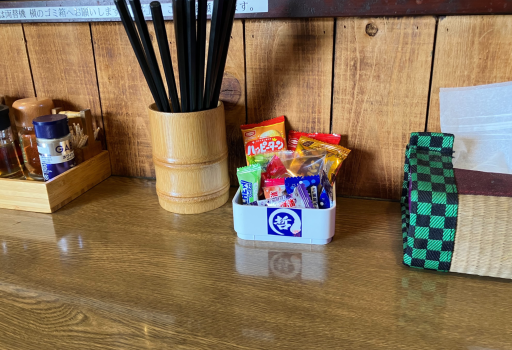 ふと目をやると、カウンターにはハッピーターンなどのスナック菓子が。