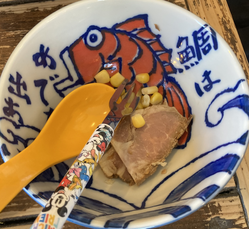 娘用にチャーシュー+コーンを小皿提供。自然で好印象。家族利用向き。