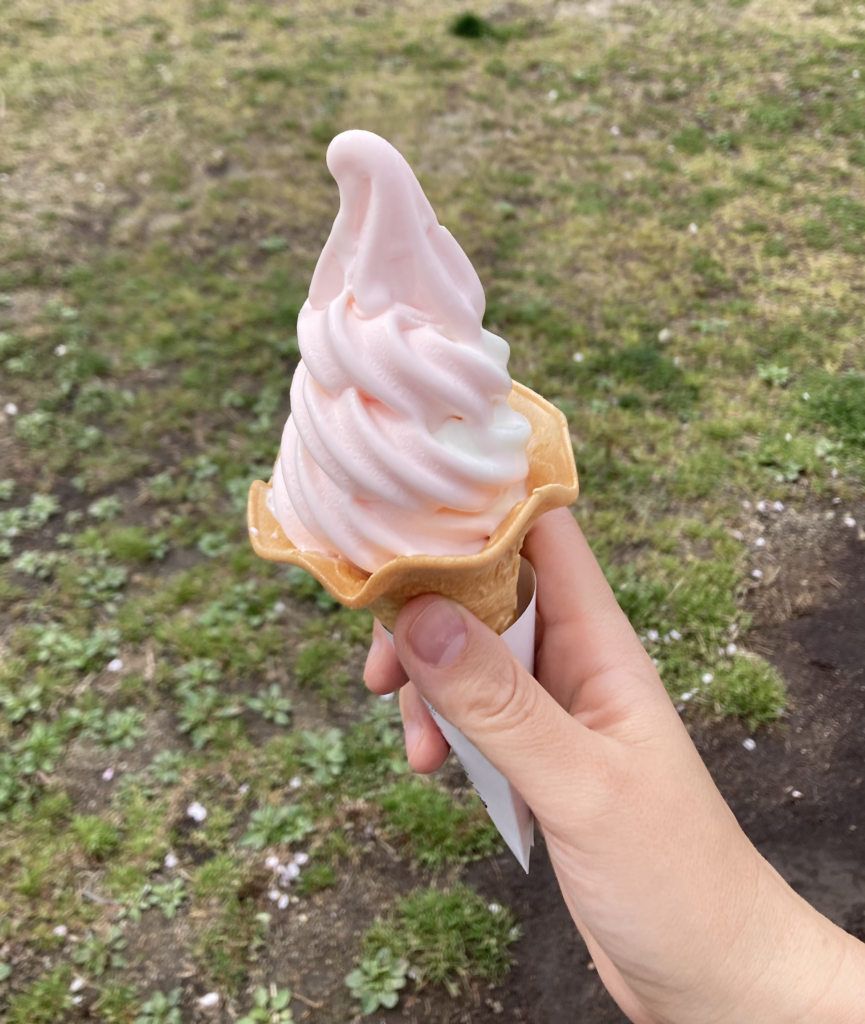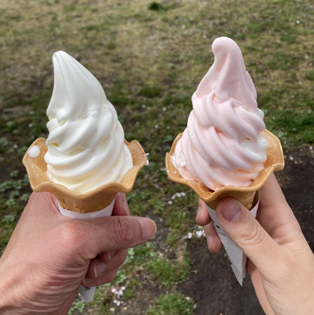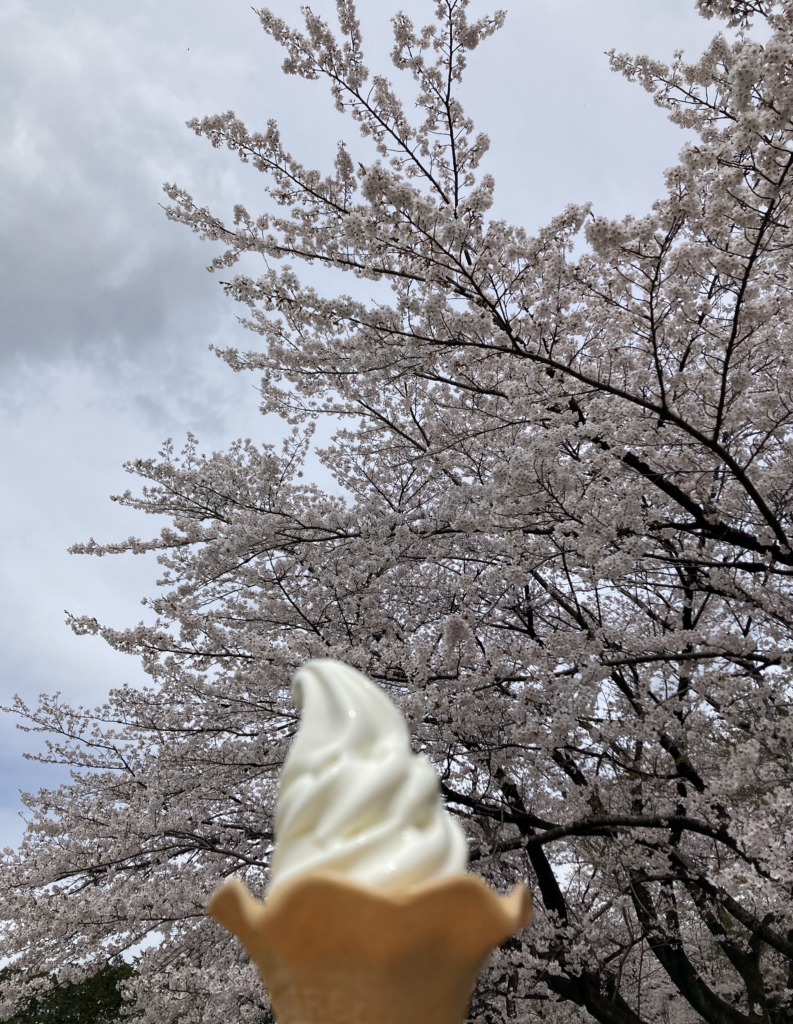 濃厚なソフトクリームを桜の下で