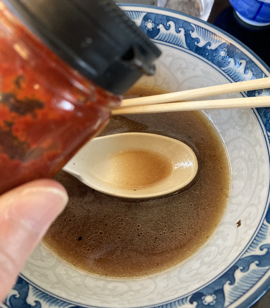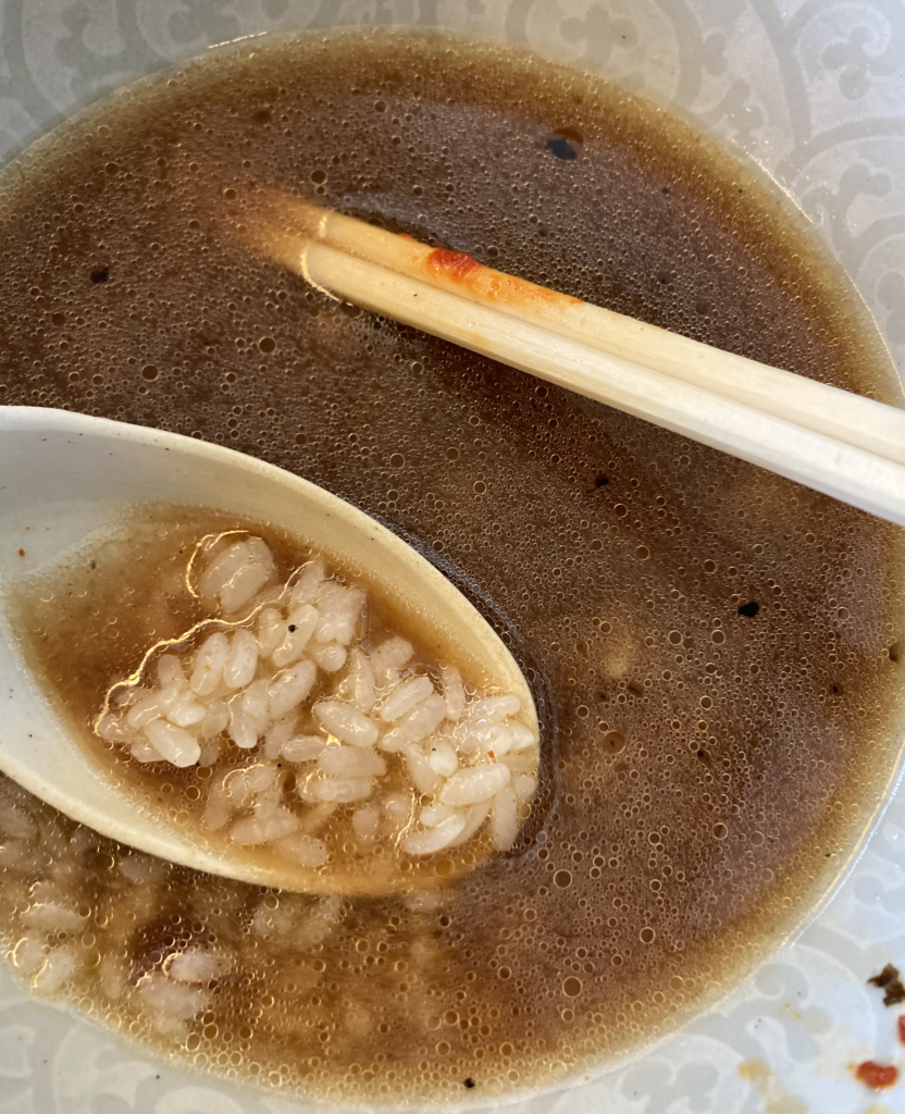 スープに豆板醤を投入し、残しておいたライスを入れる。
