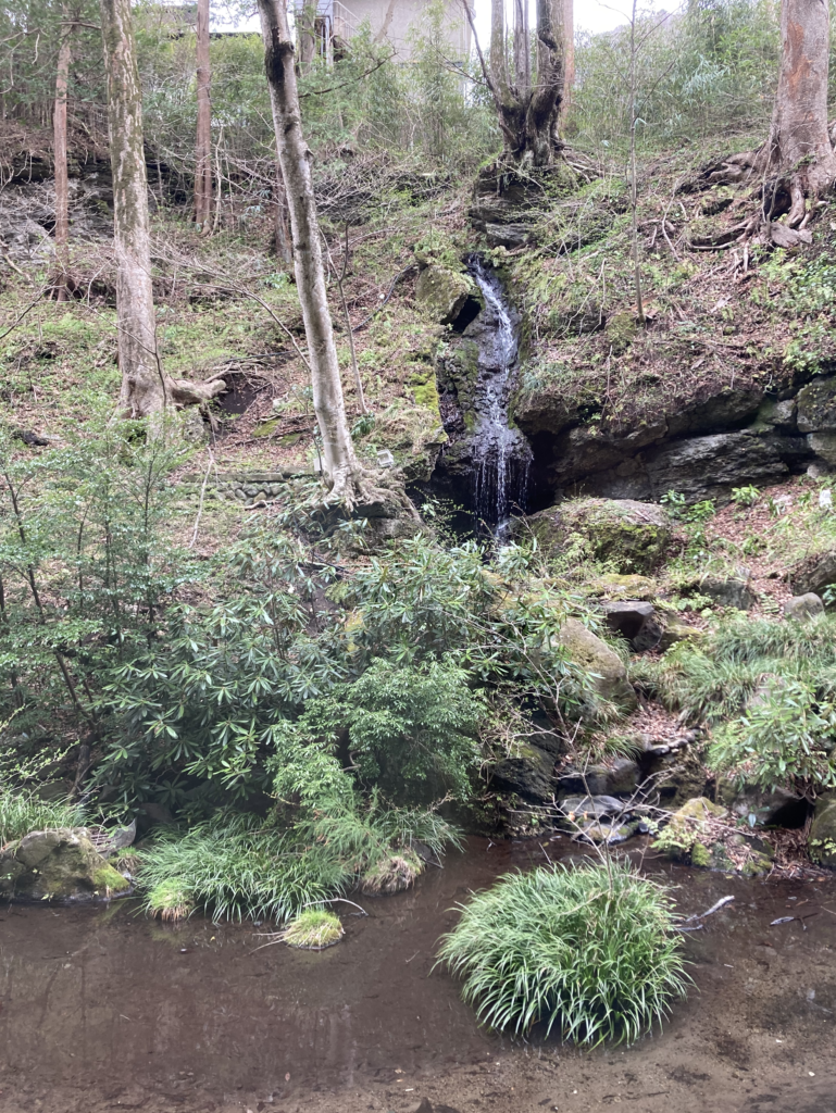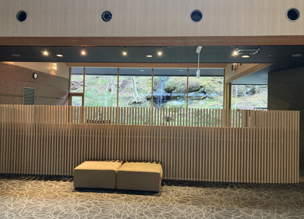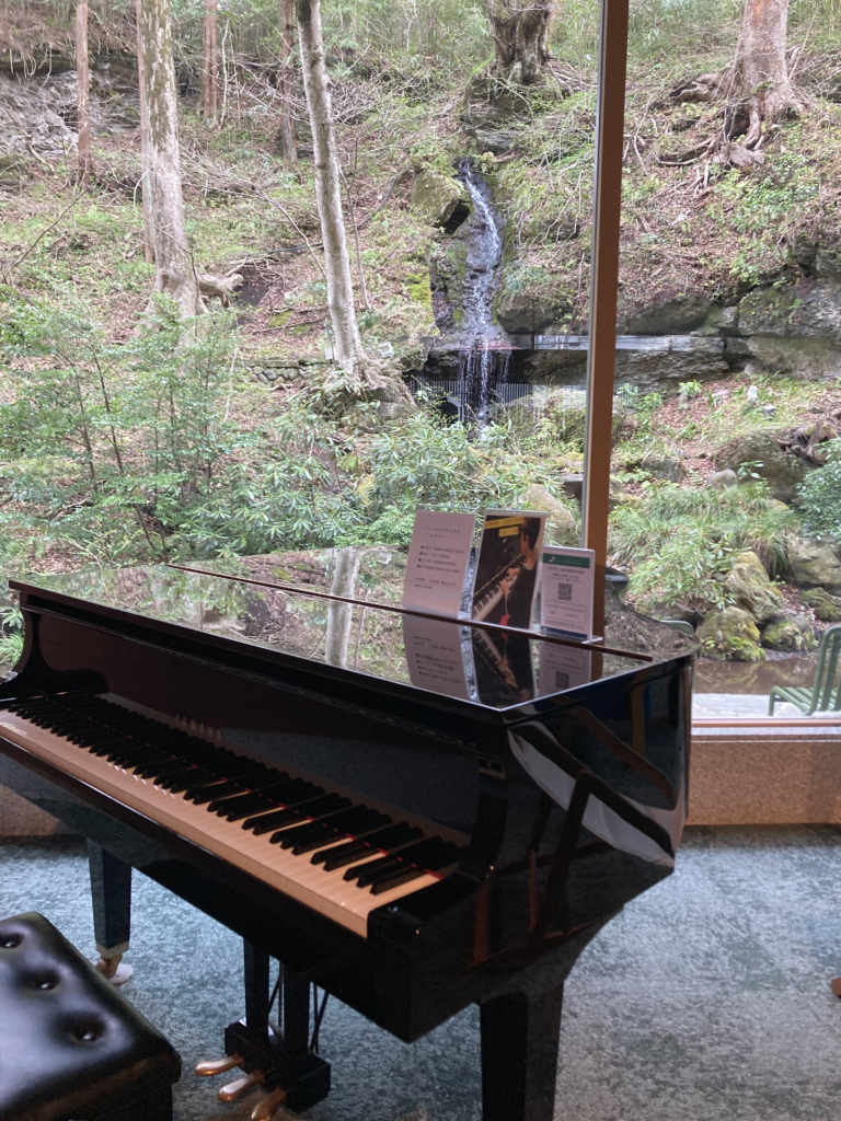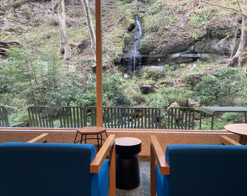 窓の外には滝が見え、自然の動きと音が、そのまま空間の一部として取り込まれています。