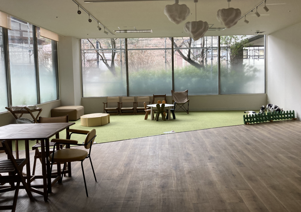 靴を脱ぐスペースには、子ども用の机や椅子、そして遊具。