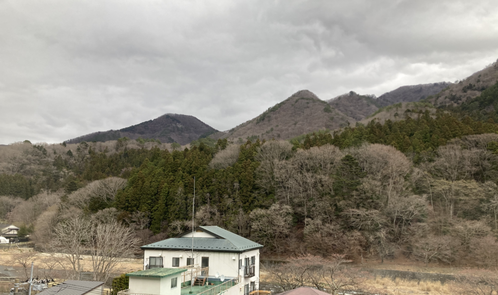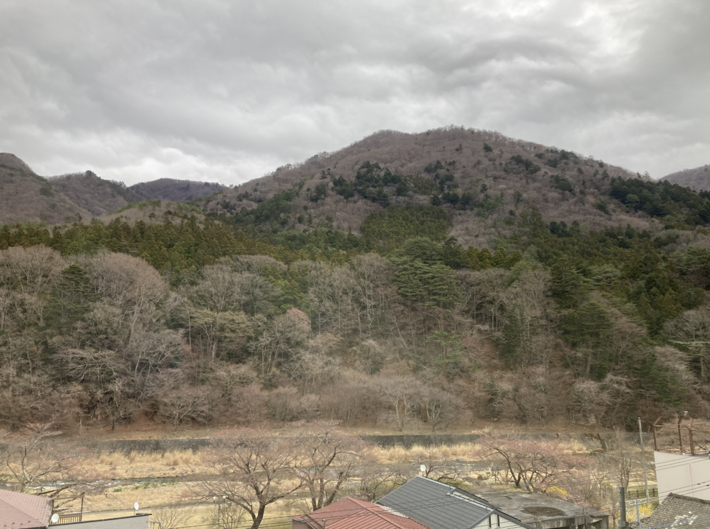 窓の外には山と川。