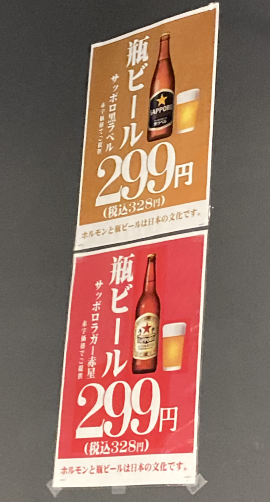 瓶ビール299円(税込328円)。