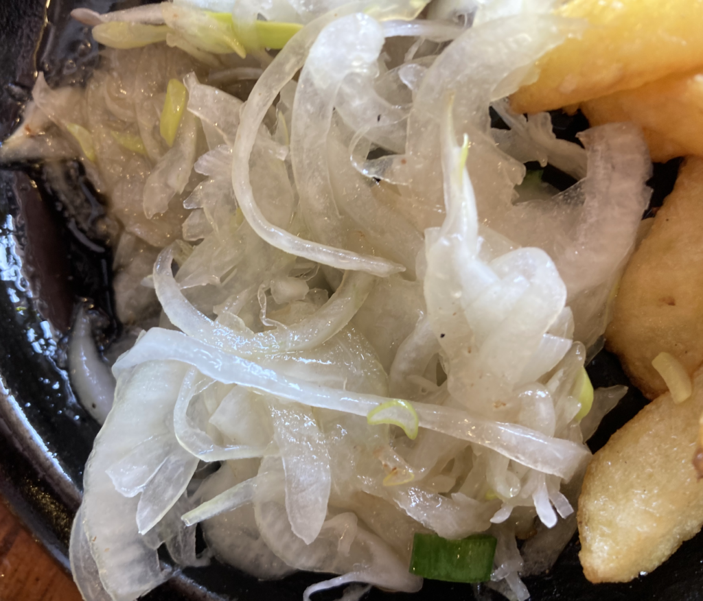 熱々の鉄板に玉ねぎを乗せ、しっかりと火を通す。