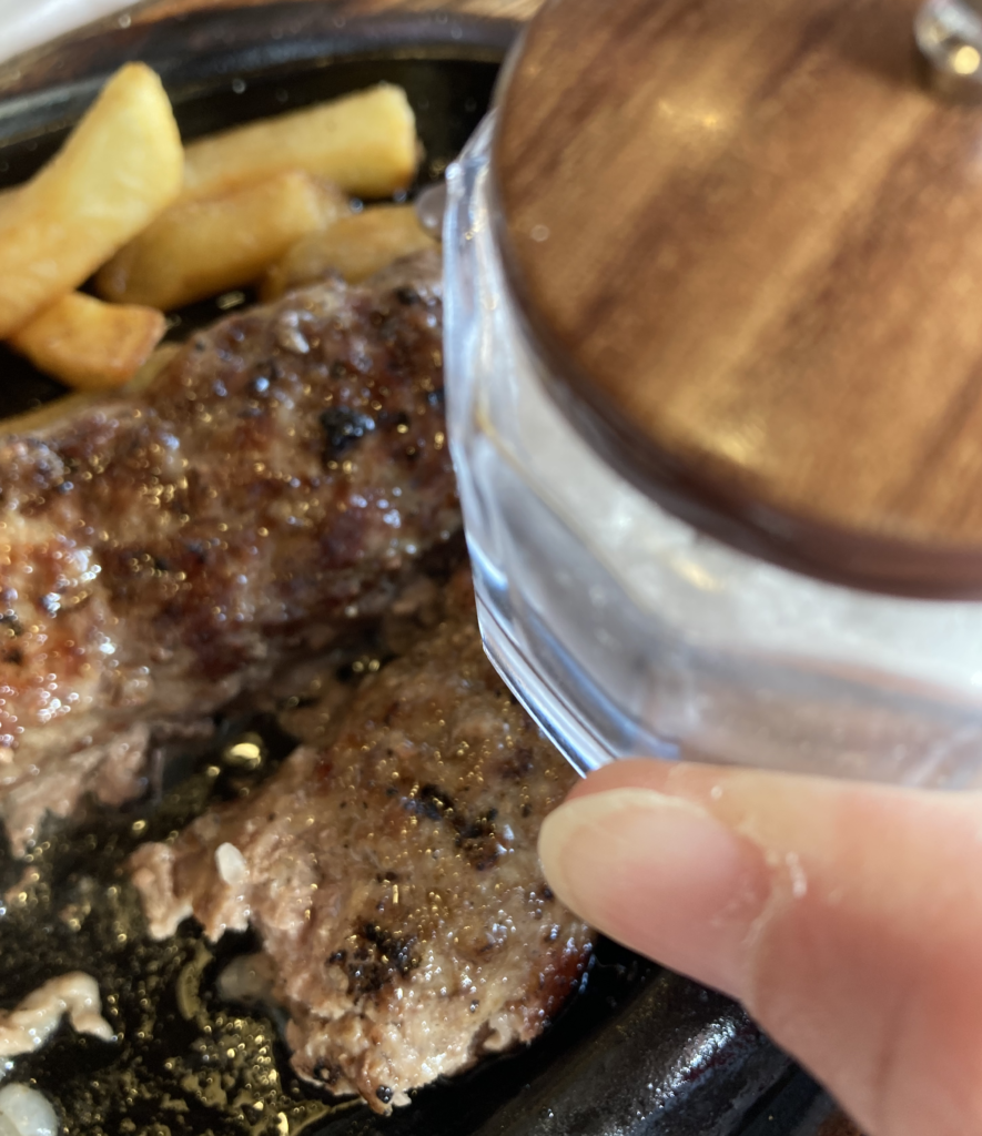 ハンバーグだけでなく、ご飯にもマルドンの塩をかける。